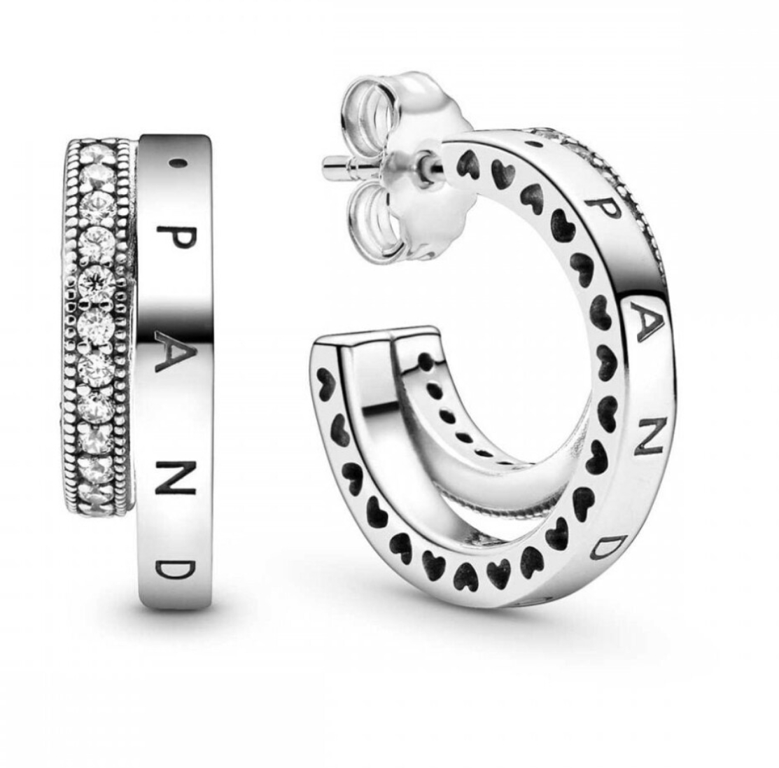 Double the wow factor with these sterling silver Pave Double Hoop Earrings. The small band features micro-beading and a row of clear cubic zirconia pave, while the large band has cut-out hearts and the brand logo. The difference in the size of the circles creates a gap between the bands, adding dimension and a detail that draws the eye. Put on these double hoop earrings to take your look to the next level.